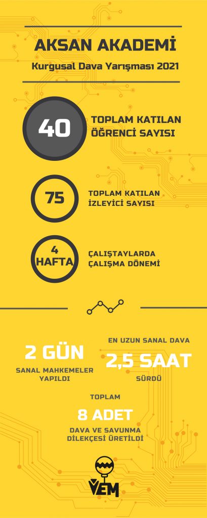 Dava yarışmasının, online ortamda gerçekleştirilen ilk sanal mahkeme ve duruşma olma özelliği taşımasının yanı sıra; Aksan Hukuk Bürosu iş birliğiyle gerçekleştirdiğimiz dava yarışmasıyla bugüne kadar hiç yapılmamış bir projeye daha imza attık. Bu proje ile mahkemelerin sanal ortamda gerçekleştirilebilmesinin de önünü açmış olduk.